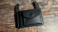 Feita com três tipos de couro de espessuras e texturas diferentes. Troquei a posição dos bolsos: nos moldes originais, o bolso maior é aplicado na parte traseira.
