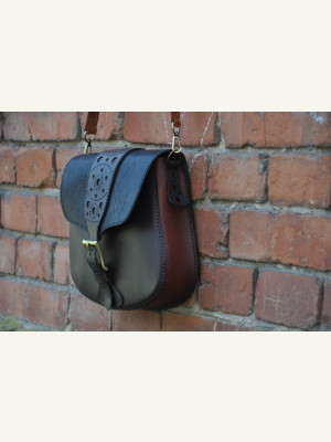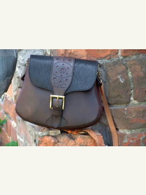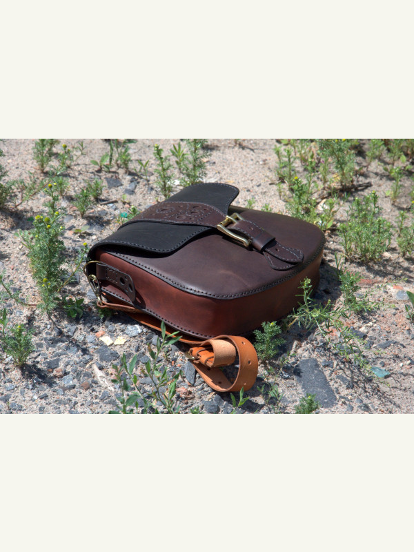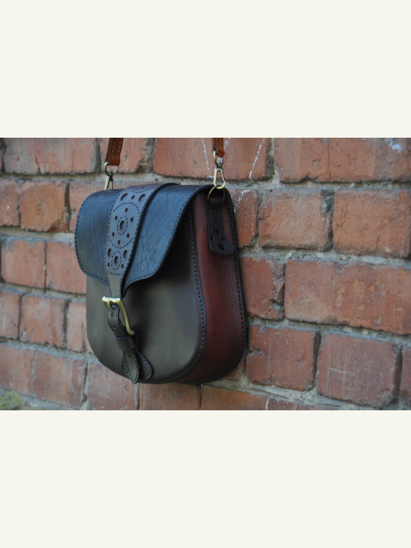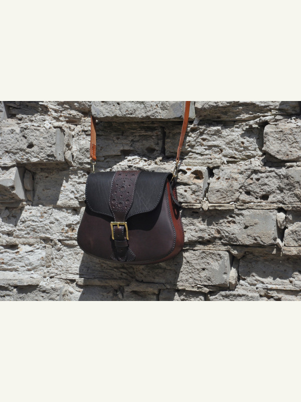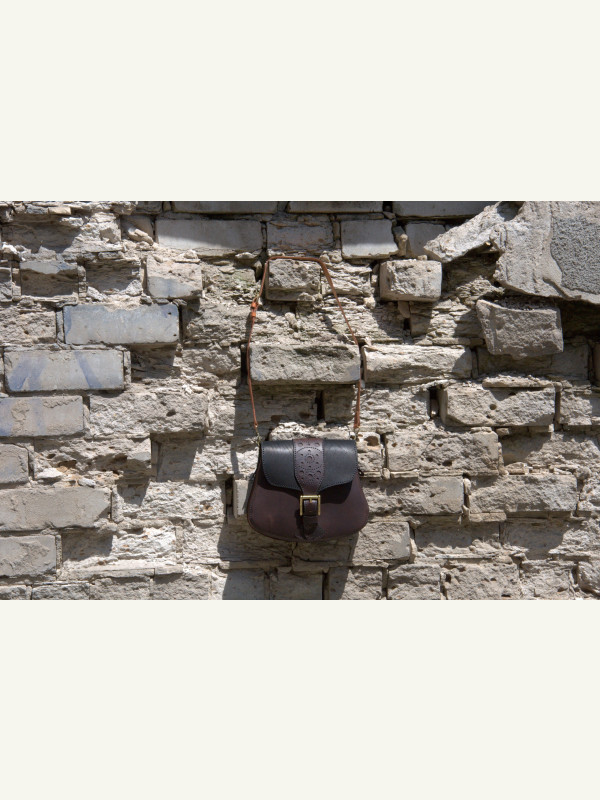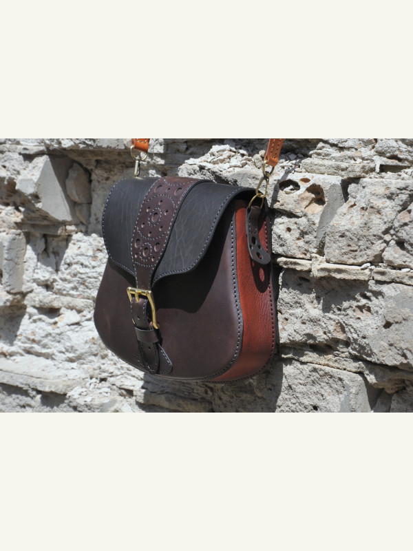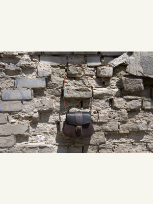 Feita com três tipos de couro de espessuras e texturas diferentes. Troquei a posição dos bolsos: nos moldes originais, o bolso maior é aplicado na parte traseira.