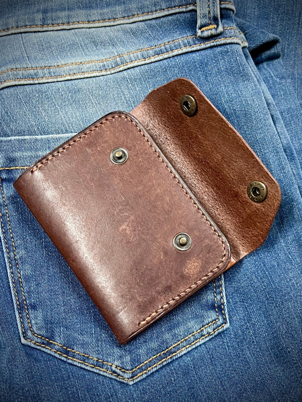 • Olá! Chegou uma nova cor de Crazy Horse (turquesa), a vontade de criar foi lá no topo — fiz esse cardholder. O autor do molde está indicado nele mesmo! Passo do punção: 4 mm. A alça para prender no pulso não está no molde — foi um extra meu.