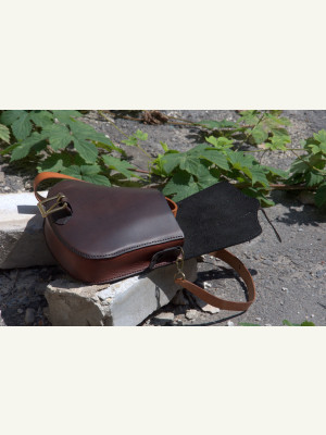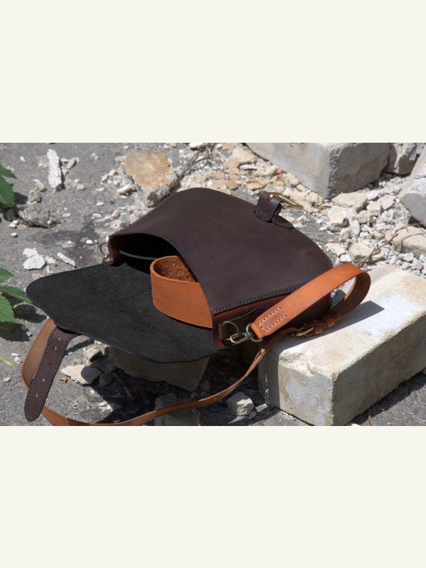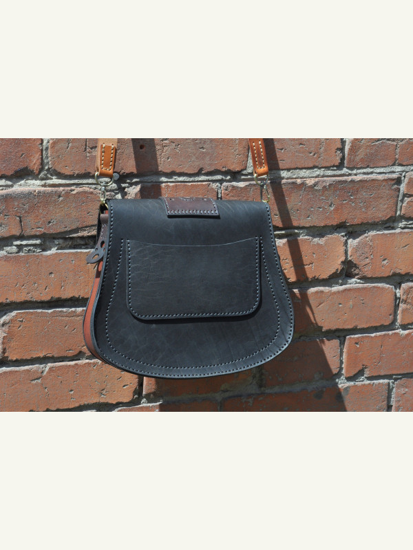 Feita com três tipos de couro de espessuras e texturas diferentes. Troquei a posição dos bolsos: nos moldes originais, o bolso maior é aplicado na parte traseira.